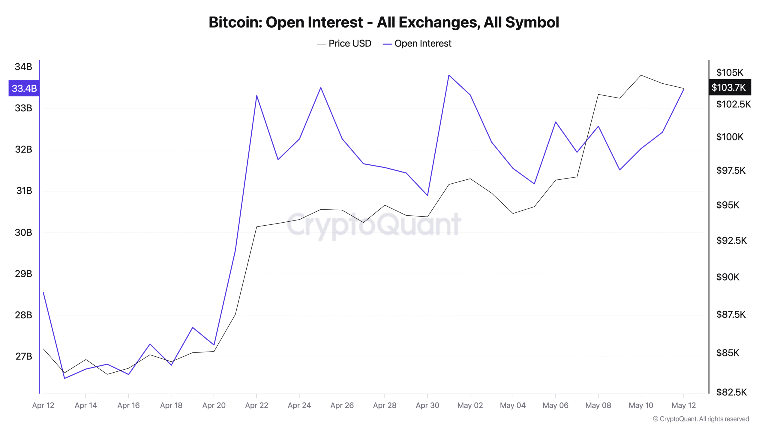 Open interest across all Bitcoin derivatives reached $33.3 billion on May 12, up from $21.2 billion on April 11. This 57% rise marks one of the year’s fastest open interest expansions.