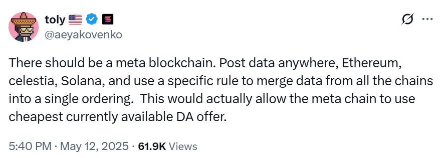 In a May 12 post on X, Yakovenko proposed a “meta blockchain,” that could aggregate and order data posted across multiple layer-1 chains, including Ethereum, Celestia and Solana.