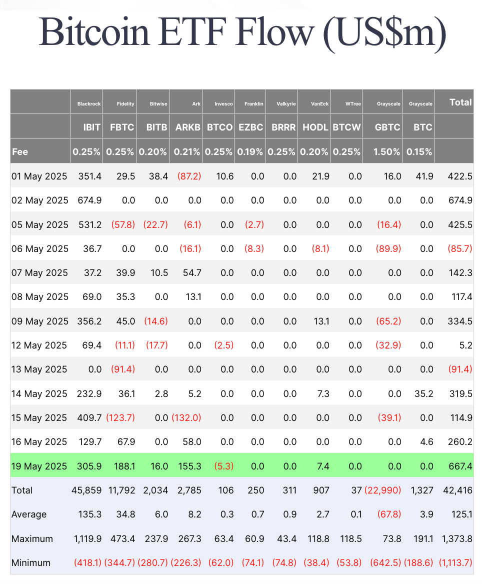Spot Bitcoin ETFs saw $667.4 million in inflows on May 19, the second-largest single-day inflow this month, marking a four-day streak of net positive flows.